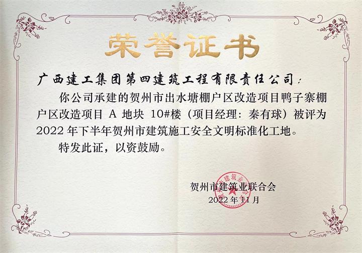 打造“高標準”文明工地。以標準化制度為主線,實現(xiàn)人員“進場流程、安全檢查、安全設施、安全防護”標準化,建立13個在建項目微信交流群,每日報送項目建設情況,全方位推進文明工地建設。公司實施的平安居棚改項目、出水塘鴨子寨棚改項目均榮獲“2022年下半年賀州市建設工程施工安全文明標準化工地”。